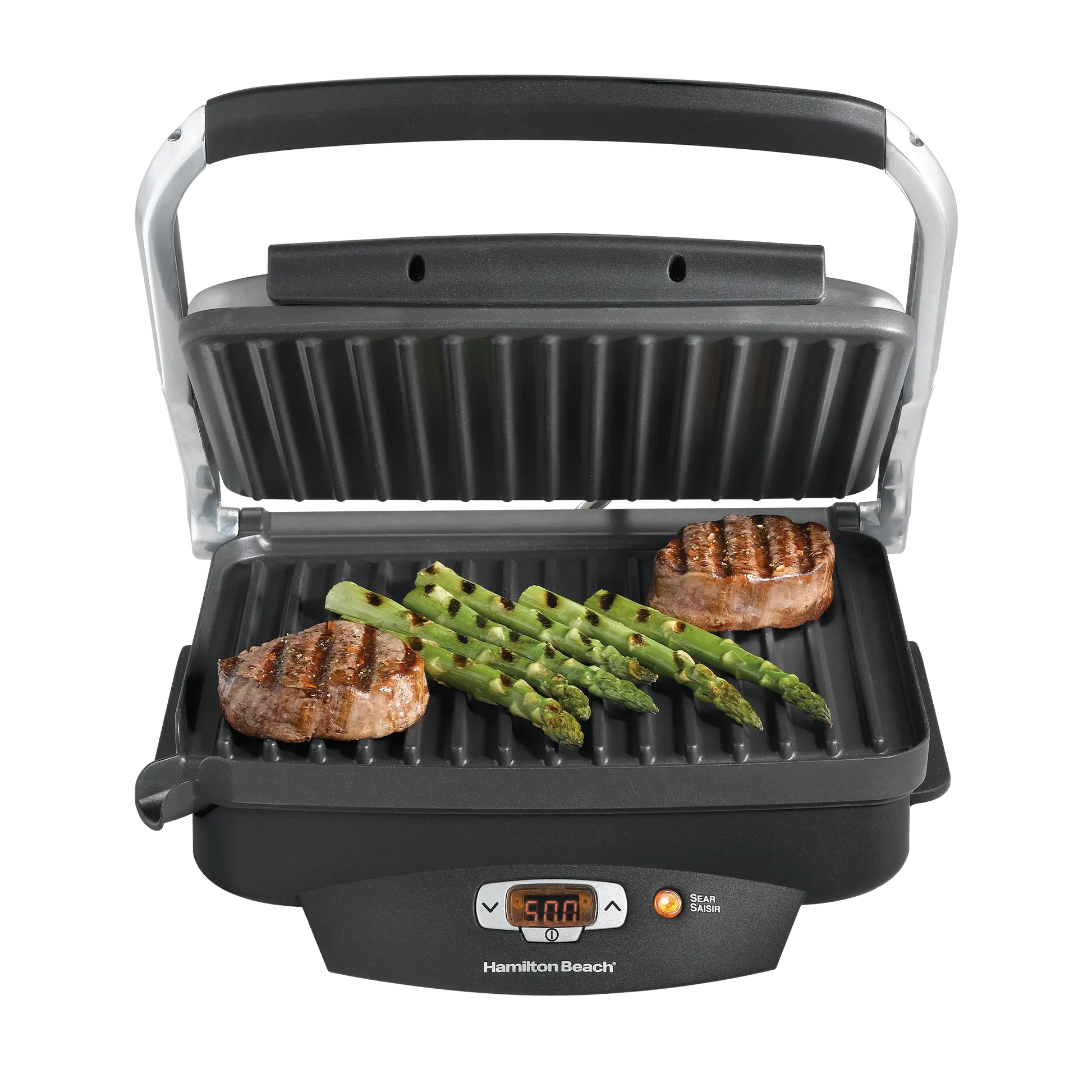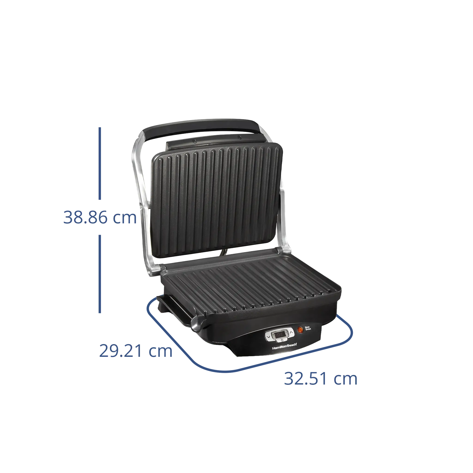 Disfruta el sabor del grill electrico al aire libre desde la comodidad de tu cocina con la Hamilton Beach® Steak Lover's Indoor Grill. Diseñada para alcanzar temperaturas de hasta 260 °C (500 °F) con solo presionar un botón, esta parrilla eléctrica sella jugos y sabores para lograr carnes tiernas y doradas en minutos.