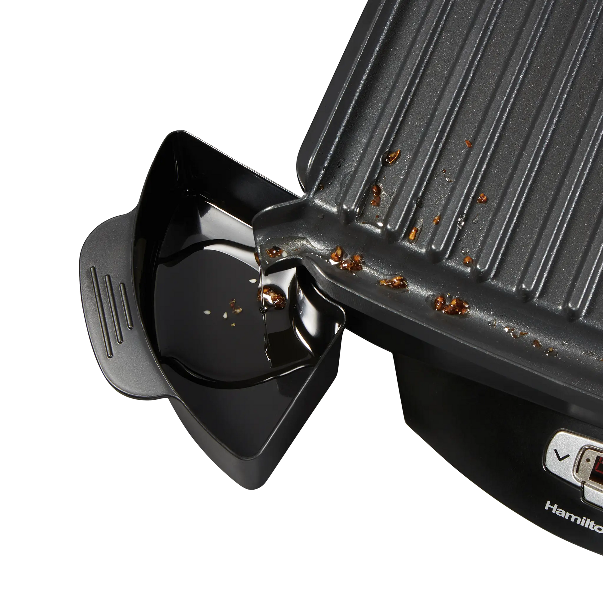 La bandeja de goteo removible atrapa el exceso de grasa para una cocción más ligera y saludable, mientras que las placas antiadherentes facilitan la limpieza. Obtén comidas rápidas, deliciosas y con acabado profesional en menos de 10 minutos, sin necesidad de carbón ni gas.