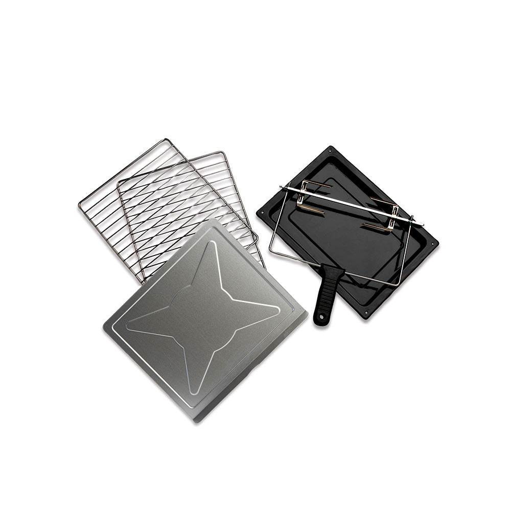 - Incluye bandeja esmaltada para hornear y para goteo, brocheta para rostizar y elevador