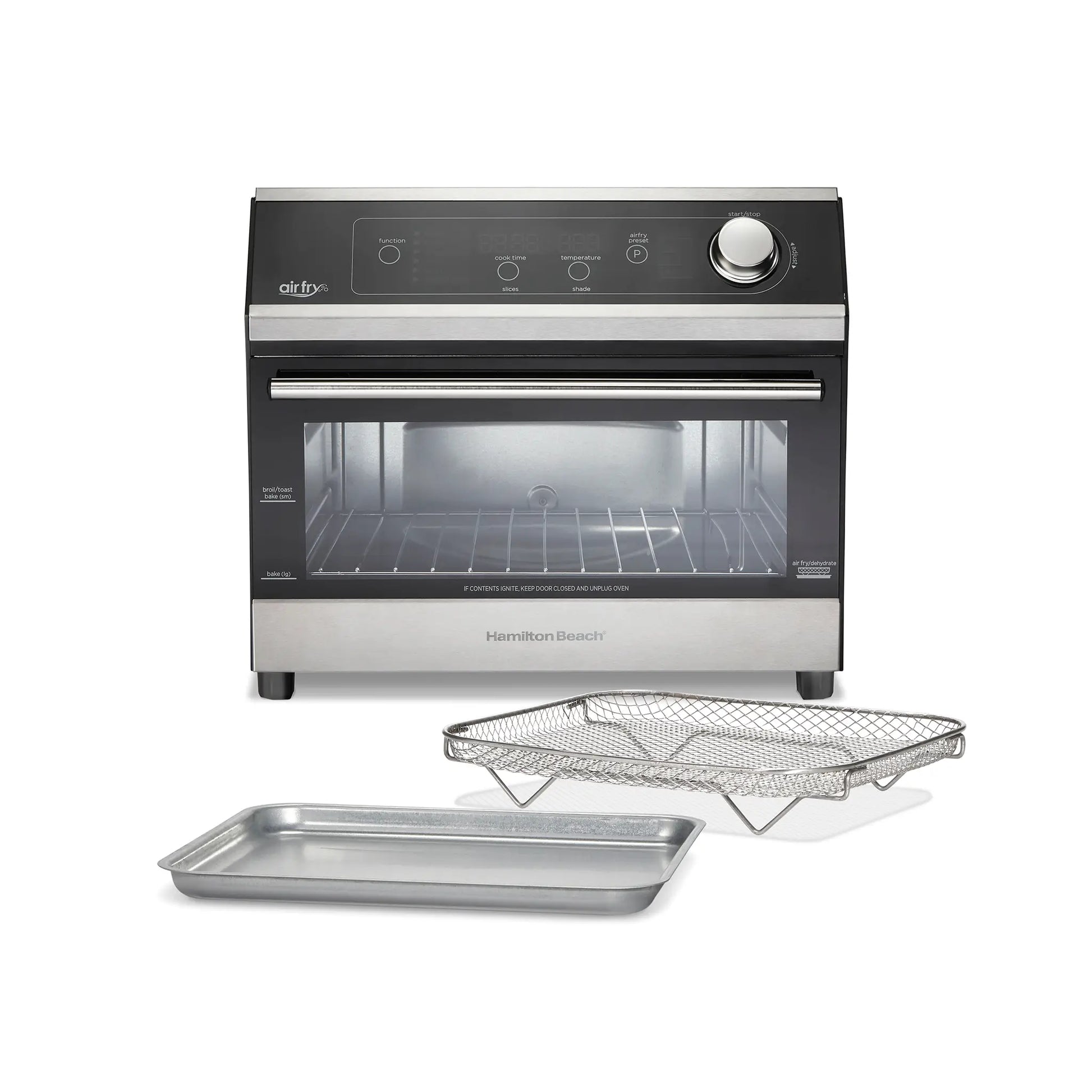 El Hamilton Beach 31220 combina horno tostador y air fryer digital en un solo equipo. Con 1800 W, cocina hasta una pizza de 12". Funciones: hornear, asar, tostar, freír con aire, deshidratar y convección, con 4 preajustes de air fry para resultados crujientes y uniformes con poco o nada de aceite. Incluye canasta de malla, charola para hornear y rejilla para asar.
