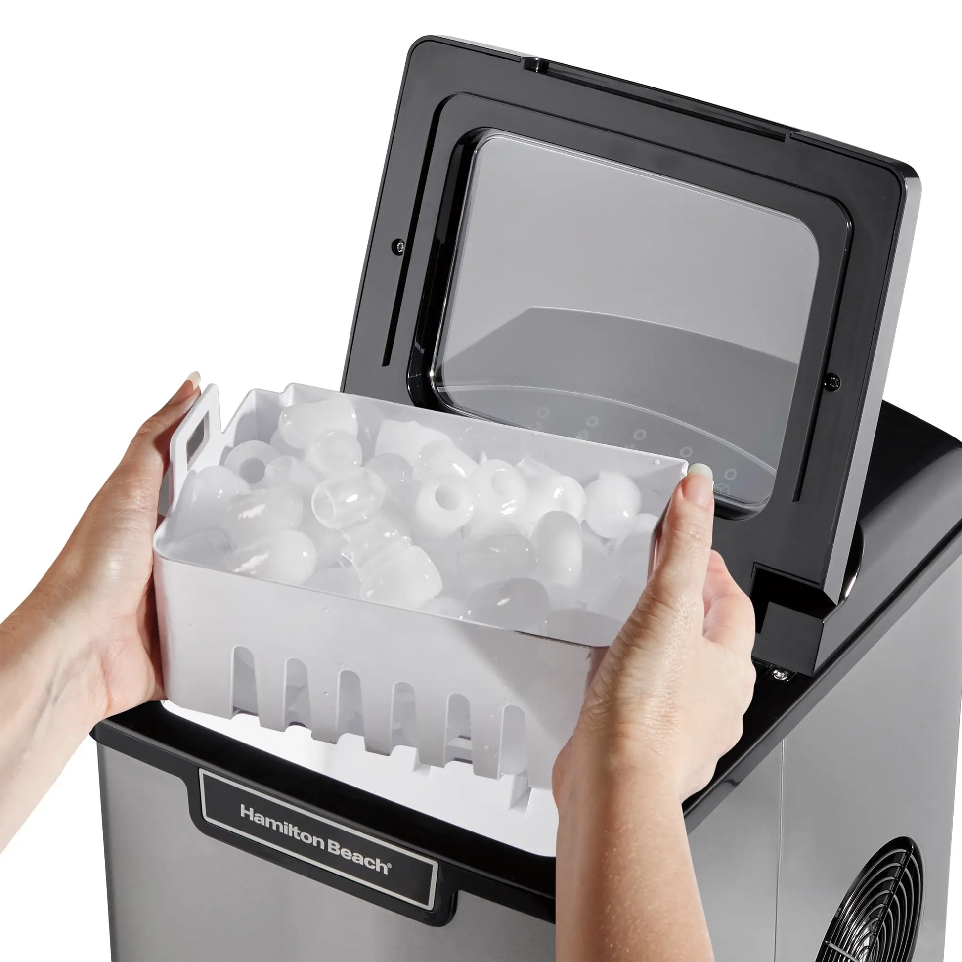 Mantén un suministro constante de hielo con la Hamilton Beach® Countertop Ice Maker 86150. Esta práctica máquina comienza a producir hielo en tan solo 8 minutos y puede generar hasta 28 libras de cubos al día, eligiendo entre dos tamaños diferentes según tu preferencia.