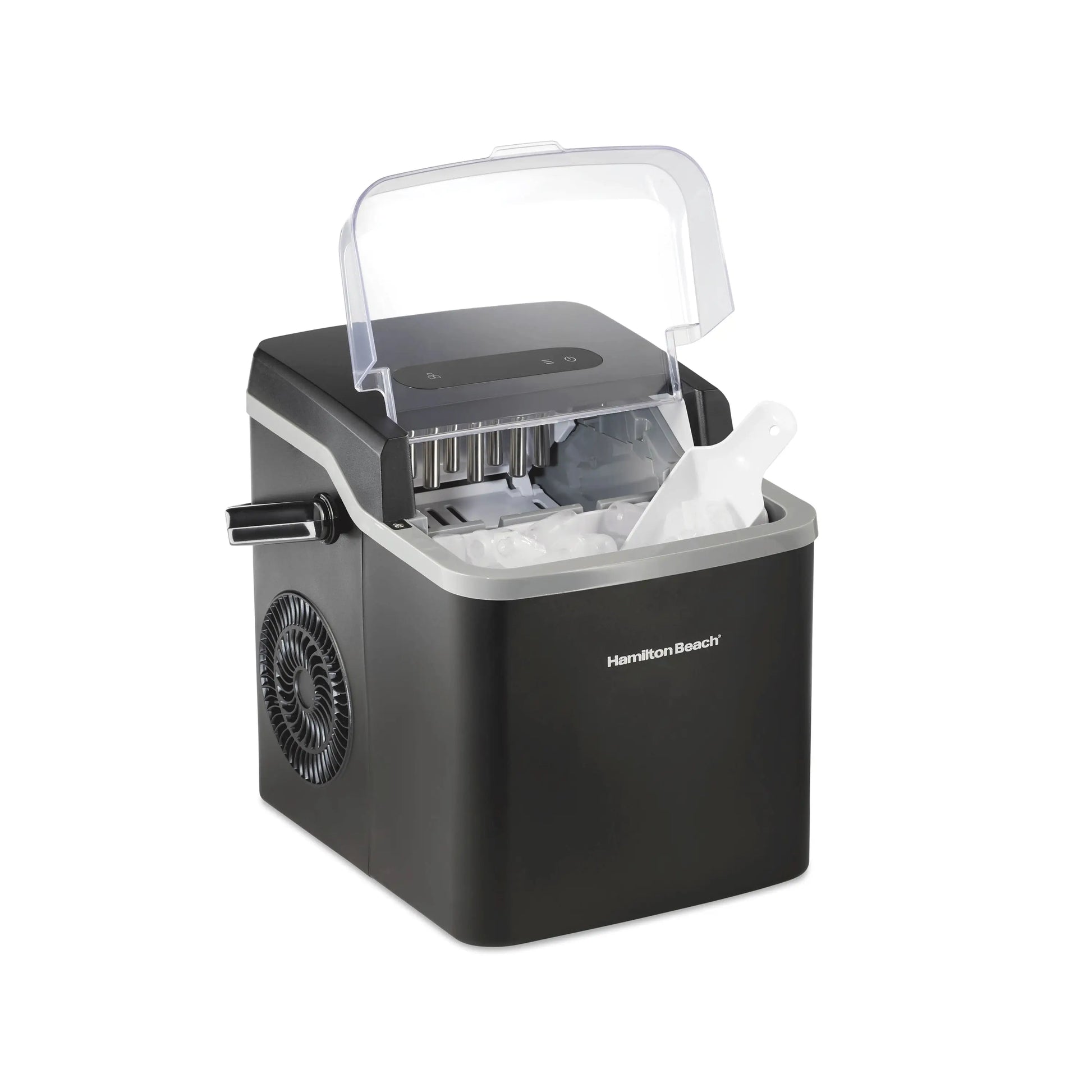 La Máquina de Hielo Hamilton Beach® con asa fácil de transportar es perfecta para reuniones, fiestas, parrilladas, viajes, eventos familiares o simplemente para mantener hielo fresco todos los días. Produce una tanda de hielo en tan solo 6 minutos y hasta (12 kg) por día, suficiente para llenar hasta 96 vasos.